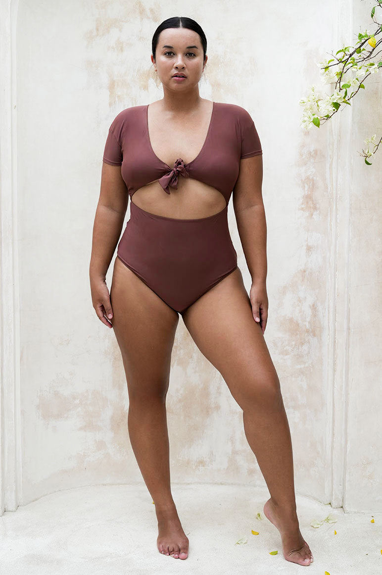 The CLARA is a plunge one piece surf suit with front tie detail and cut out. We're calling it. This is the perfect suit to live in all year round.